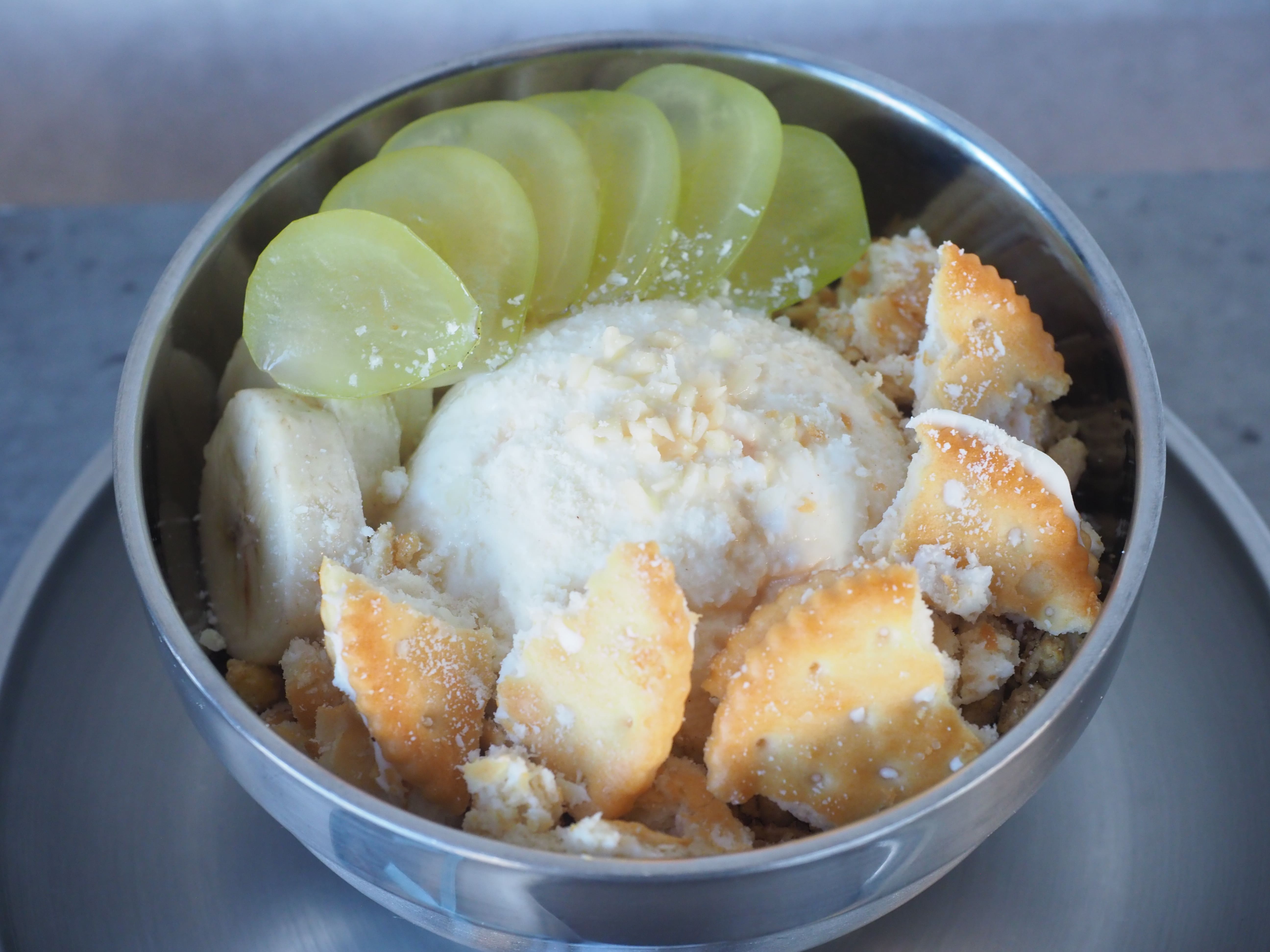バニラクリームを塩気のあるクラッカーで挟んだビスケットとグラノラでサクサク食感。